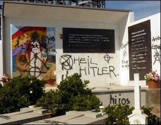 Por segunda vez la pintura negra sobre el Memorial emborrona los versos de Marcos Ana, la reproducción de La Niña y las pintadas con insultos al uso, cruces gamadas y saludos a Hitler que revelan el fuste de la criminalidad política de sus ejecutores y sus cómplices. Porque sorprende, claro, la complacencia del “sistema” con estos “antisistema” dedicados a enterrar Memoria, Falsear la Historia y sembrar el miedo, quizá porque constituyen, como en los años 30 de pasado siglo, una “reserva espiritual” nada desdeñable para quienes la felicidad es el dominio y la verdad, mentira.