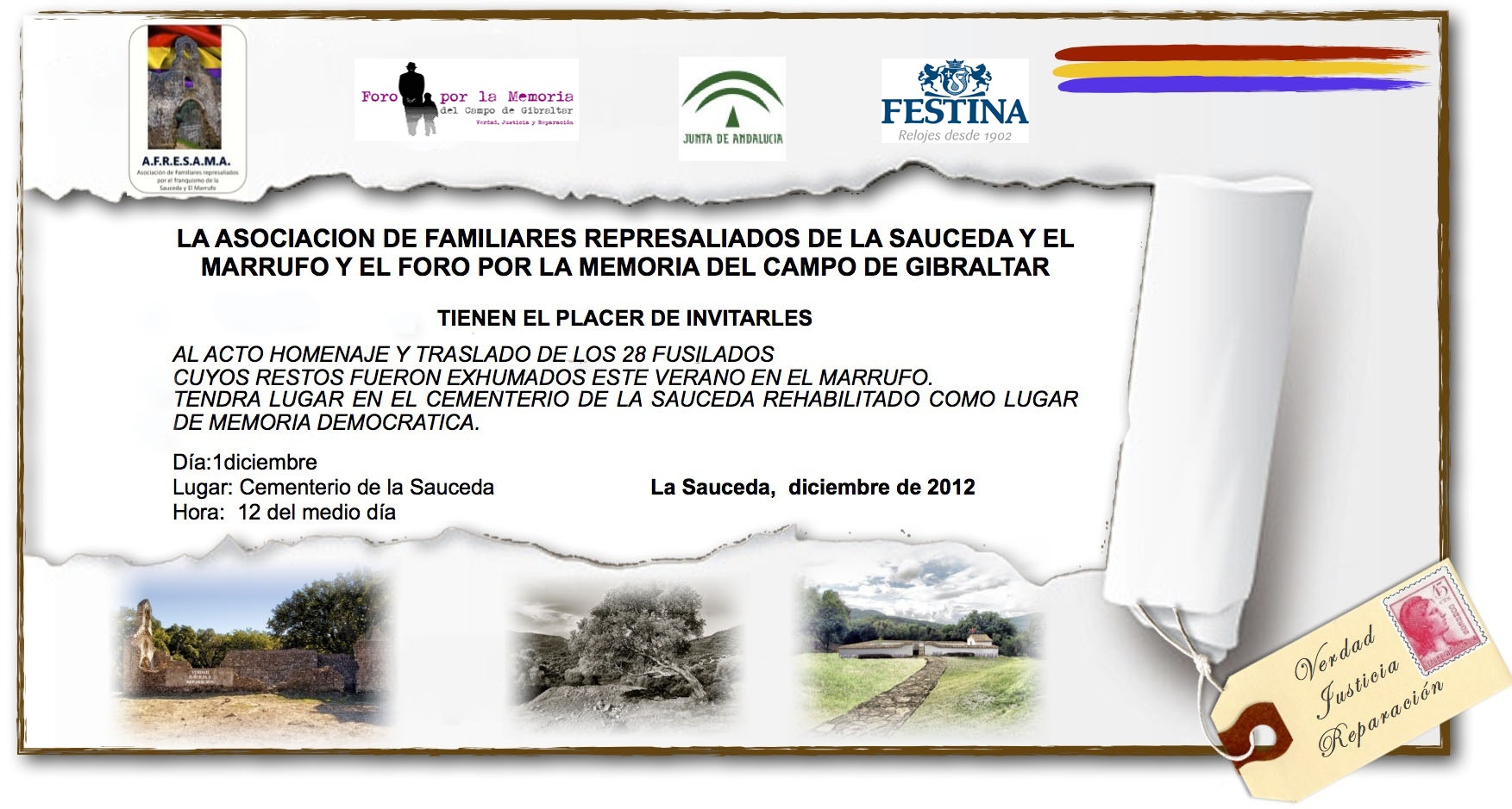 Tenemos el placer de invitarles al Acto Homenaje y traslado de los 28 Fusilados por el franquismo, de la Sauceda, exhumados en el cortijo del Marrufo durante este verano.