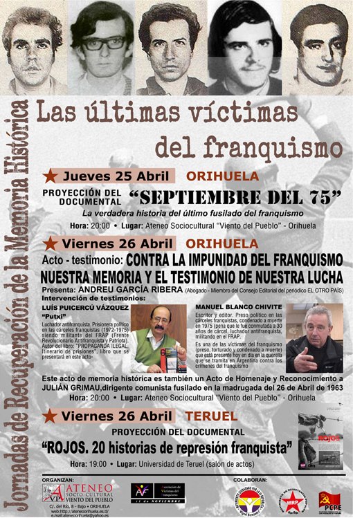 Hoy viernes 26 de abril a las 20hs, nuestros compañeros Luis Puicercú «Putxi» y Manuel Blanco Chivite, estarán en las Jornadas de Memoria Histórica en el Ateneo «Viento del Pueblo» de Orihuela.