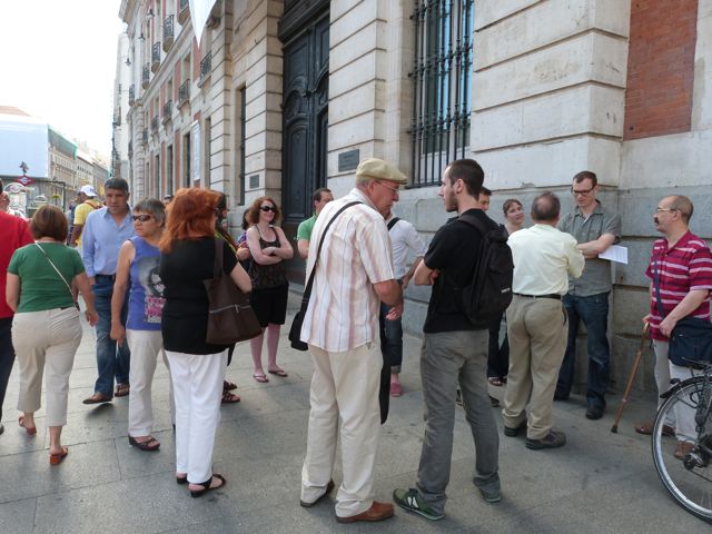Los suizos aparecieron por allí, despreocupadamente, relajados. No se diferenciaban en nada del resto de turistas que deambulaban por la Puerta del Sol en ese momento. Uno de ellos, algo más informado, preguntó por “la calle de Julián Grimau”, aludiendo a la colocación de una placa con motivo del homenaje en el 50º aniversario de su asesinato. Le explicamos que se colocó en el lugar en que fue arrojado desde una ventana por sus verdugos, en el callejón situado detrás de la DGS.
