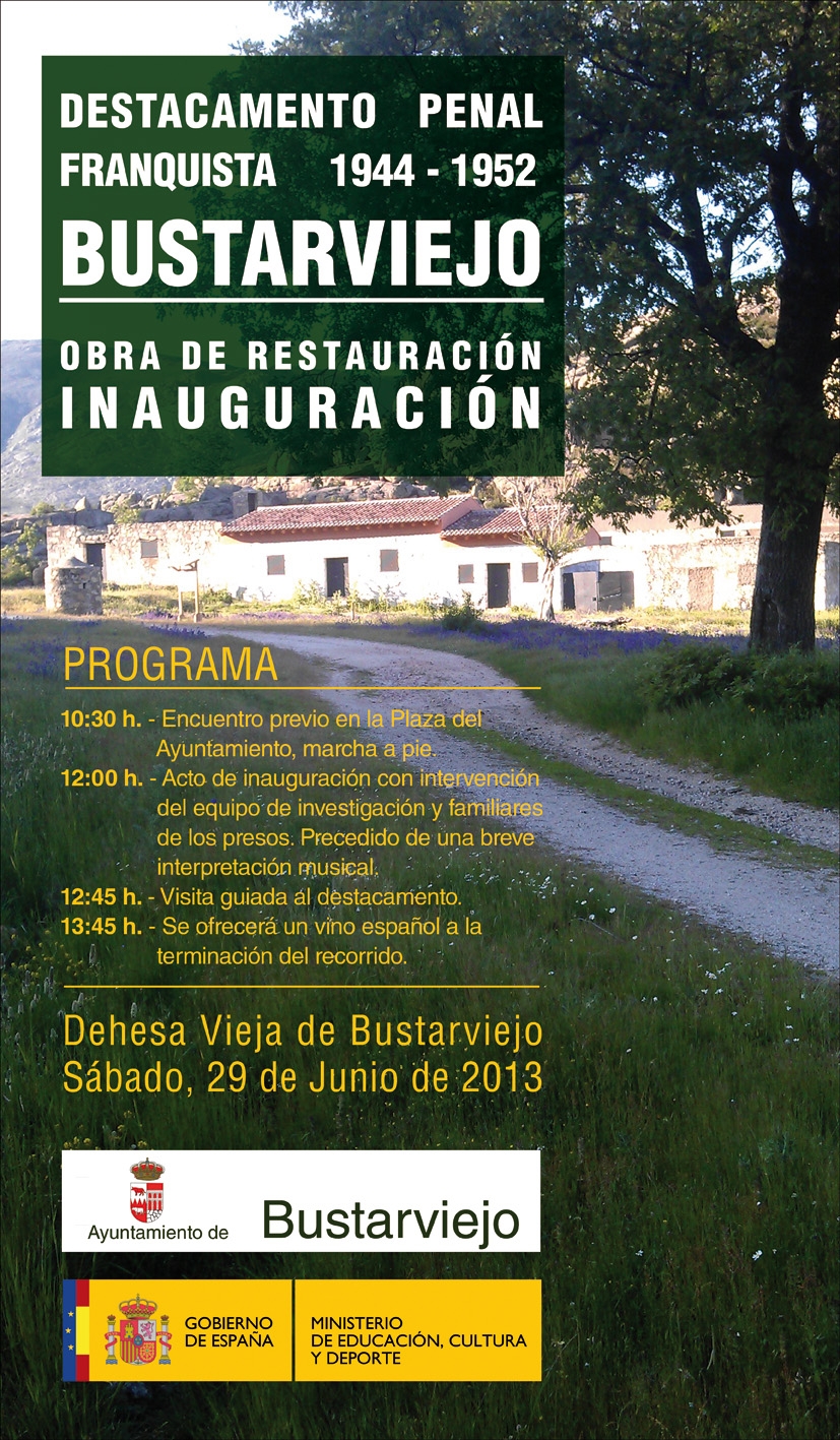 En un acto público que se prevé multitudinario, el Ayuntamiento de Bustarviejo celebrará el acto de inauguración de la obra de rehabilitación del edificio principal del antiguo Destacamento Penal franquista, en la Dehesa Vieja del pueblo. Previamente, a las 10:30hs, los participantes se han dado cita en la Plaza de la Constitución, desde donde emprenderán una marcha a pie hasta el yacimiento histórico, enclavado en un entorno paisajístico singular.