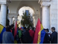 Tras el recorrido, ya en la Casa de Velázquez, con unas vistas envidiables de la sierra, unos 300 participantes se unieron para honrar a los voluntarios que lucharon en aquel lugar, que aún mantiene huellas de la violencia de la que fue testigo, como las marcas de las bombas que cayeron hace 77 años en aquel mismo edificio.