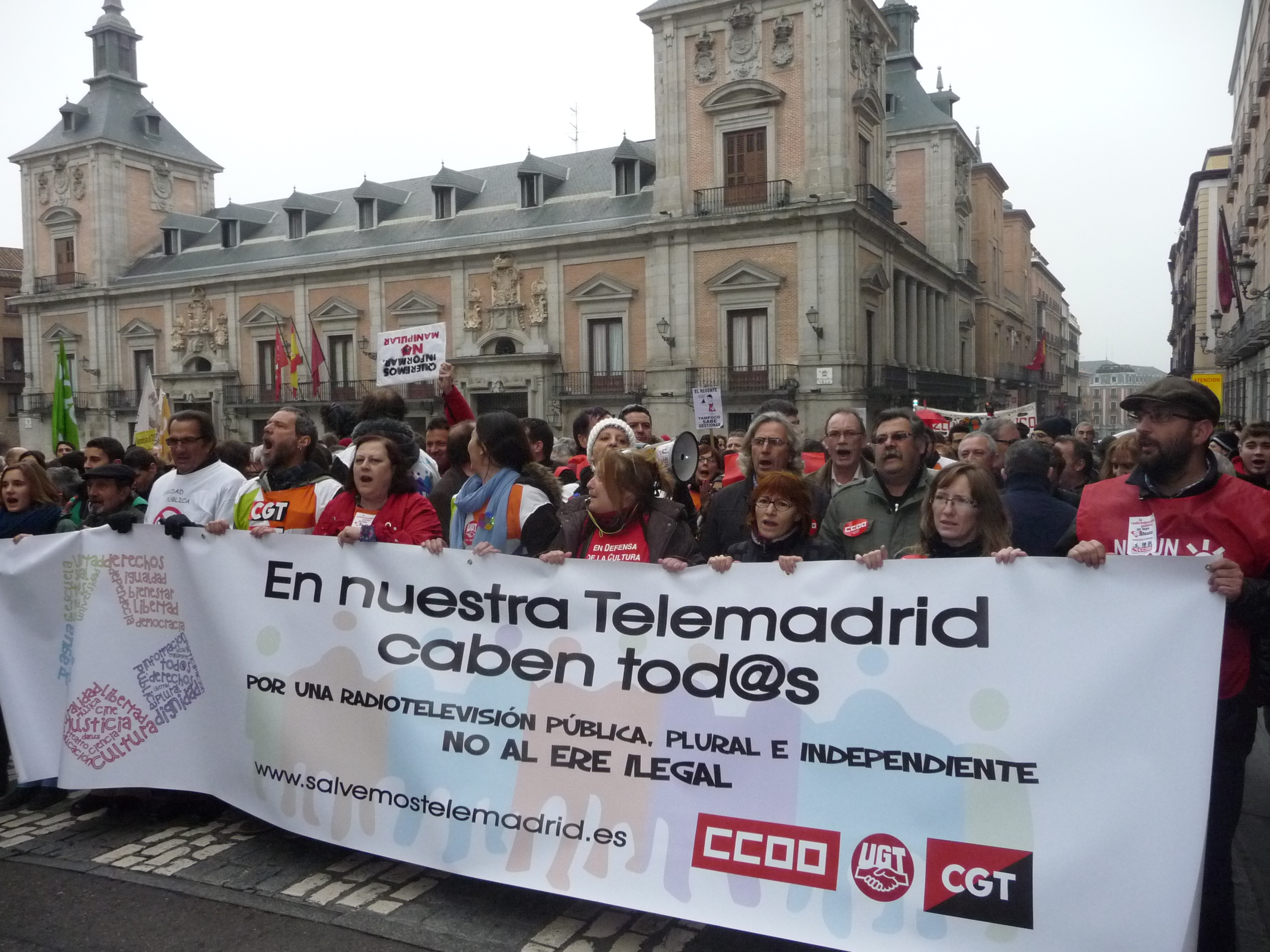 El domingo 12 de enero miles de personas se manifestaron por la anulación del ERE de los trabajadores de Telemadrid, bajo el lema “En nuestra Telemadrid caben tod@s. Por una radiotelevisión pública, plural e independiente. No al ERE ilegal”.