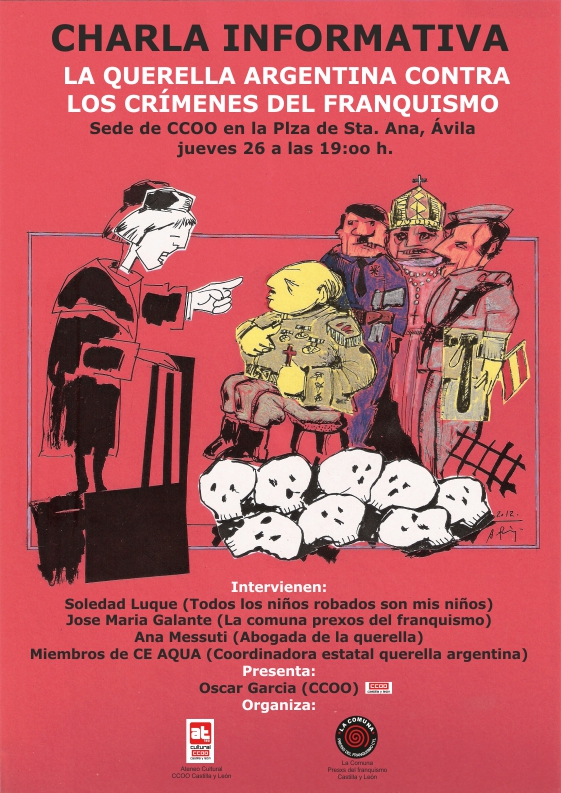 La Comuna Castilla y León junto con el Ateneo Cultural CCOO Castilla y León organizan una charla informativa sobre la Querella contra los crímenes del franquismo con las intervenciones de la abogada Ana Messuti y los representantes de CeAQUA Soledad Luque y Chato Galante.