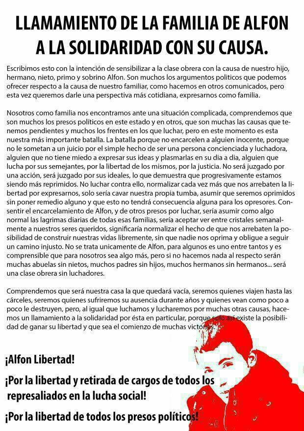 Ante el llamamiento de apoyo realizado por familiares, amigos y compañeros de ALFON, desde LA COMUNA PRESXS DEL FRANQUISMO os expresamos nuestro apoyo y solidaridad.