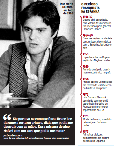 Galante dedicou-se durante um ano a encontrar seu torturador, investigando sua vida e sua carreira, para que pudesse pedir a extradição. Ele encontrou Pacheco por meio de sua inscrição em uma corrida. Seguiu o homem que o aterrorizou e descobriu: ambos moram, hoje, a 500 metros de distância um do outro, em Madrid. Ele tem um aspecto repugnante inconfundível diz à Folha. Galante conta que, além da raiva, sentiu-se feliz por tê-lo encontrado. Eu estava preparado para aquilo. Galante se lembra, ainda, de como Pacheco apelidado Billy, The Kid se portava como se fosse o Bruce Lee durante a tortura. Ele gritava, dizia que poderia me destruir apenas com as mãos. Era a mistura de algo risível com um cara que podia me matar recorda-se. A Querella Argentina está baseada na ideia de que certos crimes, como aqueles cometidos contra a humanidade, podem ser julgados em outros países. Se afeta a humanidade, não deve haver fronteiras para a justiça diz o advogado Carlos Slepoy. Uma juíza argentina aceitou o pedido de julgar ali os membros da ditadura espanhola, assim como a Espanha fez em relação ao último regime de exceção do país sul-americano (1976-1983). O argentino Adolfo Scilingo foi condenado em 2005 por um tribunal espanhol a 640 anos de prisão. Dois anos depois, a pena foi aumentada para 1.084 anos. Slepoy compara o caso espanhol ao brasileiro, no debate de suas leis de anistia, e nota que democracias, por medo ou por interesse, não fazem justiça quando sucedem ditaduras. O tema tem sido discutido por seus detratores no país como uma questão de unidade nacional, em que o pacto feito em 1977 teria sido necessário para a transição. A anistia para os criminosos da ditadura de Franco foi uma garantia apenas para eles diz Josu Ibargutxi, que participou do movimento basco e foi preso entre 1968 e 1977. O ‘delicado pacto’ serviu para perpetuar golpistas e seus herdeiros no poder. Tanto na Espanha quanto no Brasil, os crimes de lesa-humanidade cometidos durante suas ditaduras não podem ser anistiados.