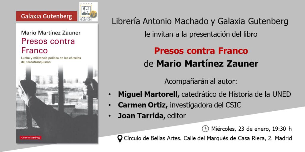 El día 23, el compañero de La Comuna, Mario Martínez, presentará en la librería Anotnio Machado su libro basado en la tesis que realizó sobre las experiencias de vida de los compañeros y compañeras de La Comuna (y otros) en las prisiones franquistas.