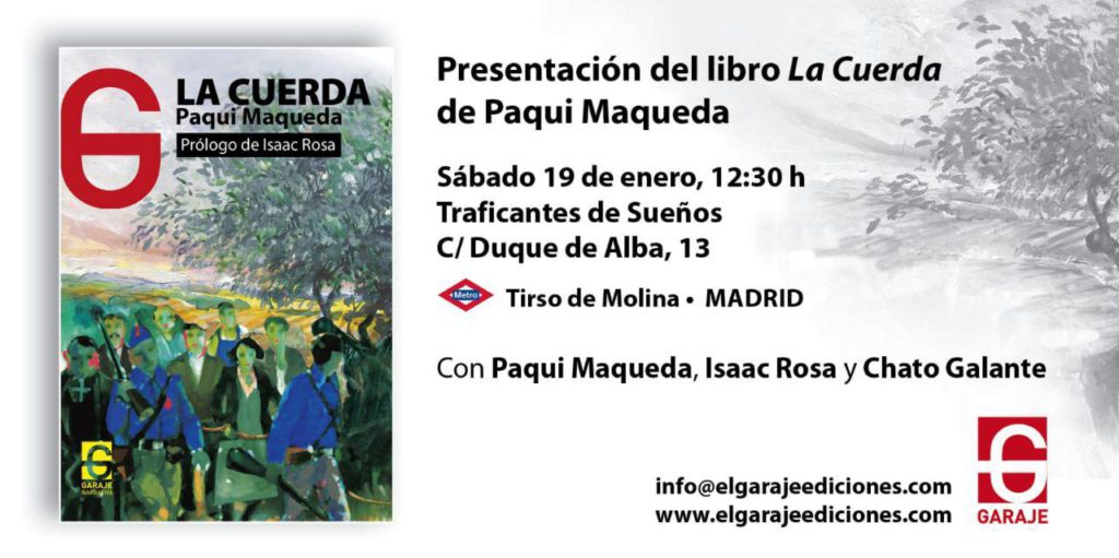 El sábado 19 se presentará «La Cuerda» de Paqui Maqueda, compañera de fatigas en CEAQuA (Coordinadora Estatal de Apoyo a la Querella Argentina), en Traficantes de Sueños. La cuerda es un relato basado en hechos reales, aunque ficcionados. Ambientada en la guerra civil española, describe a un grupo de personas que caminan un amanecer entre olivares. Algunas de ellas, unidas por una cuerda, enfrentan sus últimos momentos de vida. Serán ajusticiadas, sin juicio previo, por el simple hecho de pensar de forma diferente a sus ejecutores.