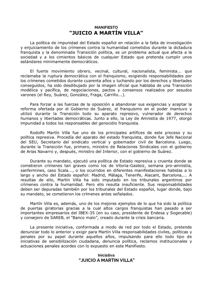Tal y como veníamos anunciando, hemos presentado el día 31 la campaña estatal para juzgar los crímenes cometidos durante el mandato de Martín Villa como Gobernador del Barcelona, como Ministro de Gobernación y como Ministro de Interior.