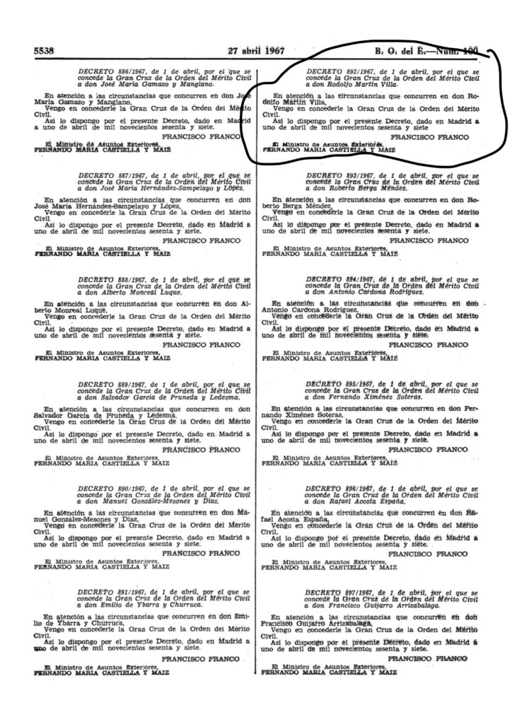 - 1967: Gran Cruz de la Orden del Mérito Civil (Decreto 892/1967 de 1 de abril). BOE 27 de abril.