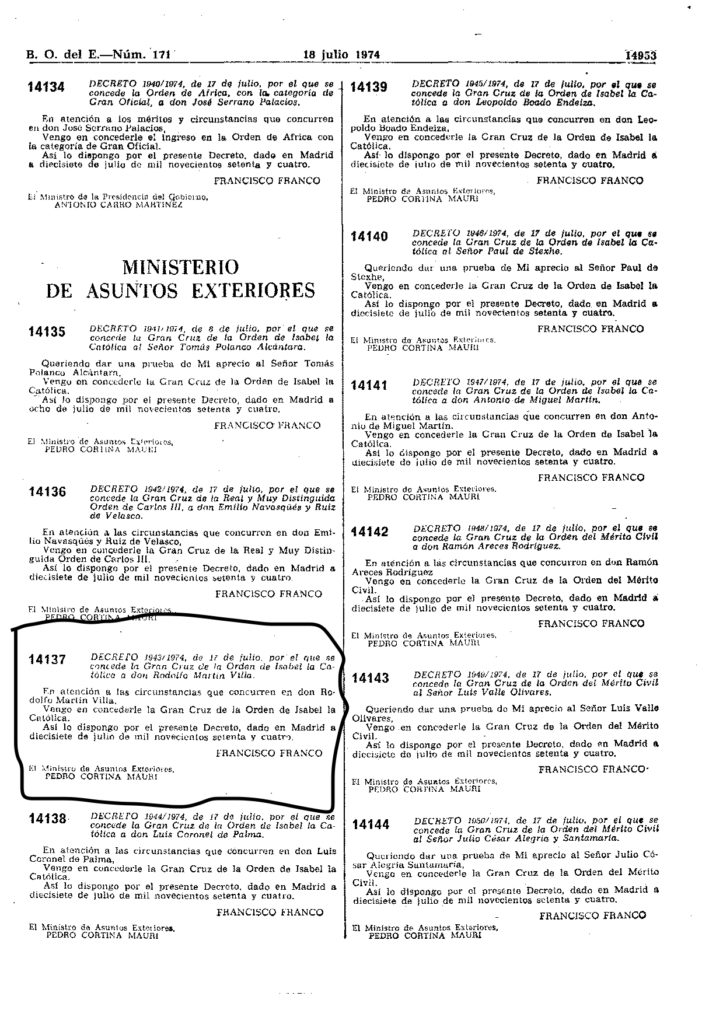 - 1974: Gran Cruz de Isabel la Católica (Decreto 1943/1974). BOE 18 de julio.