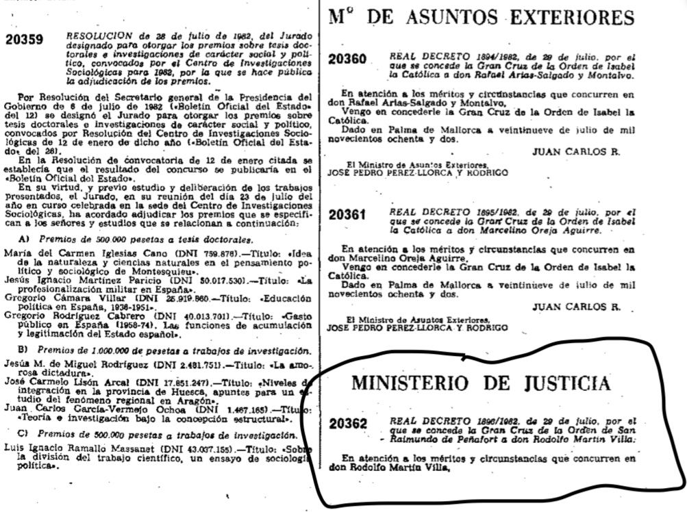 - 1982: Gran Cruz de la Orden de San Raimundo Peñafort. (Real Decreto 1896/1982 de 29 de julio). BOE 9 de agosto.