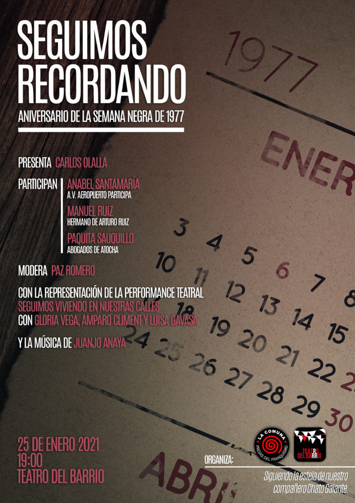 Evento en el Teatro del Barrio, gracias a los «lunes despistados» en el que habrá un poco de todo: teatro, debate y actuación musical. Nos puedes seguir por Facebook, desde el que emetiremos en directo. https://www.facebook.com/LaComunaPresxsDelFranquismo/live/