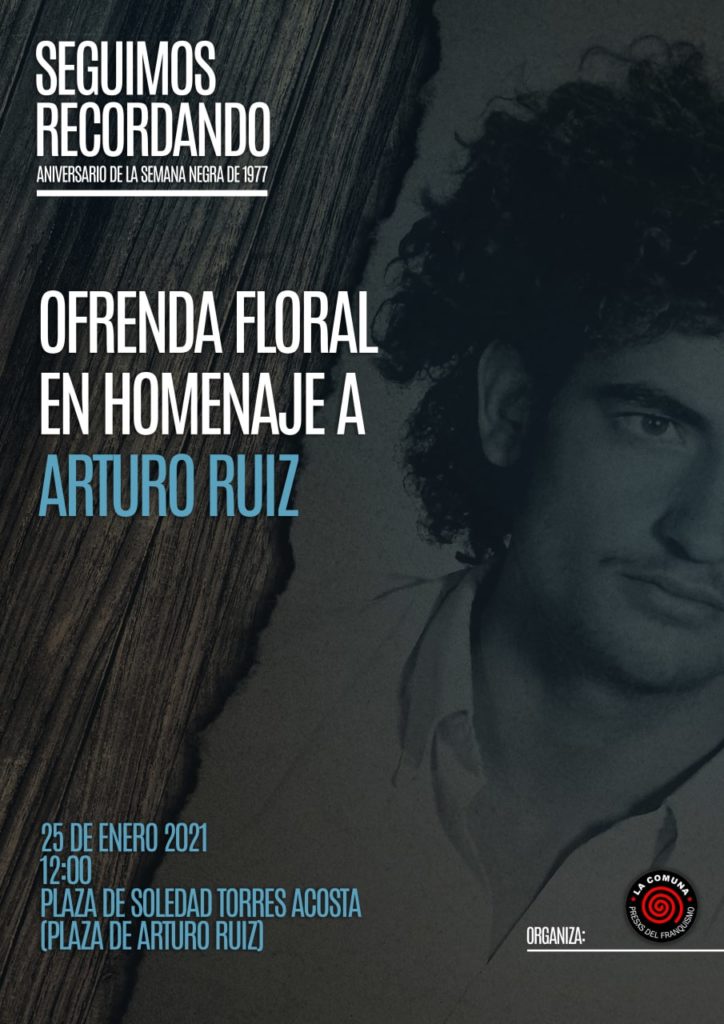 44 años después de su asesinato por miembros de la extrema derecha, seguimos pidiendo haya justicia. Un merecido homenaje al luchador antifranquista que, con su muerte, inicio lo que se llamaría «La Semana Negra de Madrid» con el posterior asesinato de Mariluz Nájera y de los abogados de Atocha. Si no puedes venir, puedes vernos a través de Facebook: https://www.facebook.com/LaComunaPresxsDelFranquismo/live/