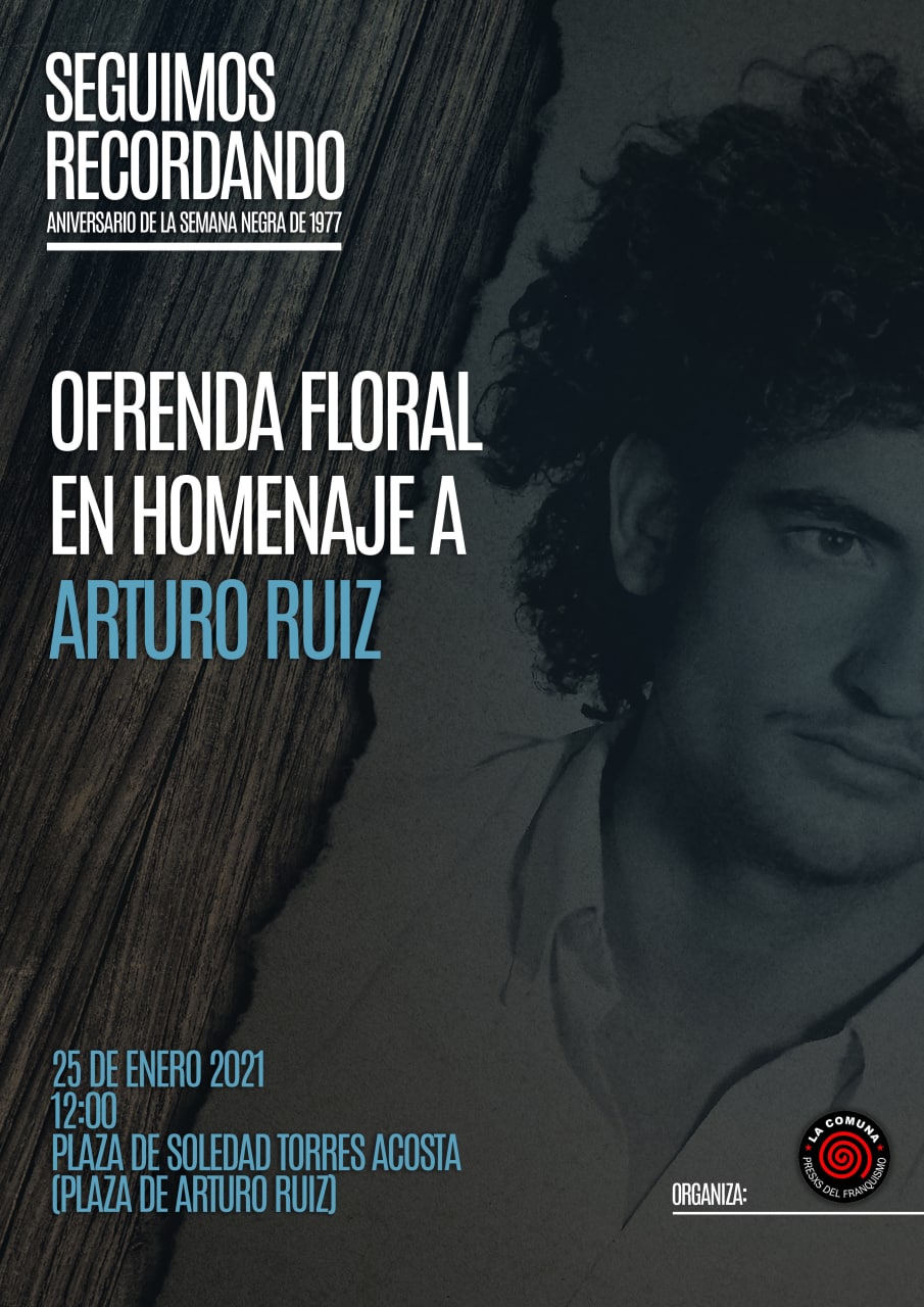 44 años después de su asesinato por miembros de la extrema derecha, seguimos pidiendo haya justicia. Un merecido homenaje al luchador antifranquista que, con su muerte, inicio lo que se llamaría «La Semana Negra de Madrid» con el posterior asesinato de Mariluz Nájera y de los abogados de Atocha. Si no puedes venir, puedes vernos a través de Facebook: https://www.facebook.com/LaComunaPresxsDelFranquismo/live/