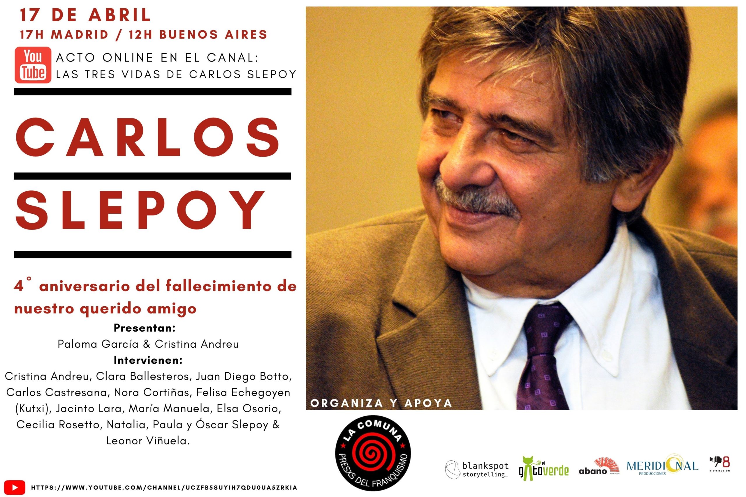 17 de abril, 17 horas. 4 años tras el fallecimiento de Carlos Slepoy, le rendiremos un homenaje intercontinental que puedes seguir aquí: https://www.youtube.com/channel/UCzFB5SUYIh7Qdu0ua5ZRKIA