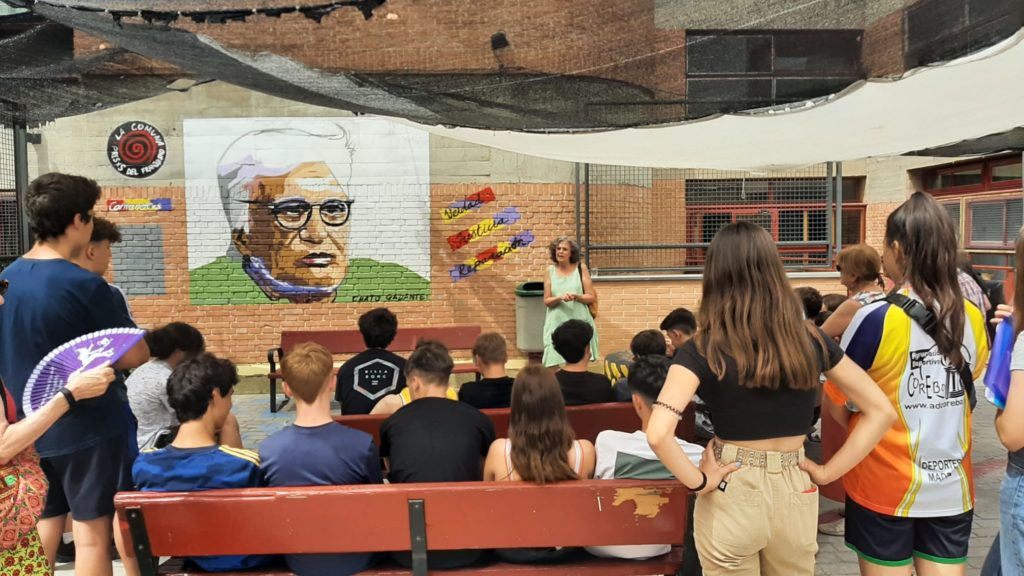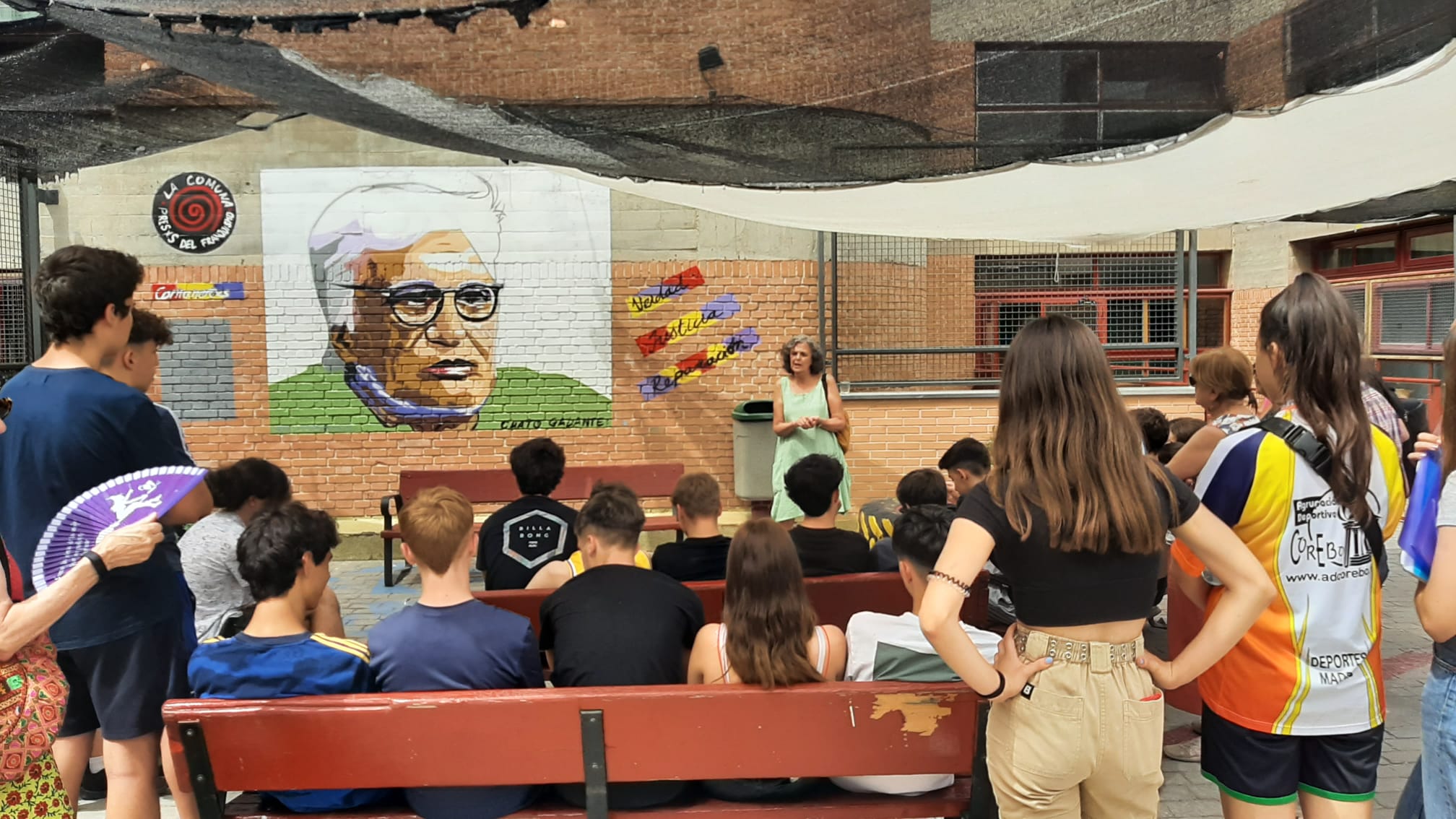 A la emoción de ver la imagen de Chato en el patio de este magnífico colegio, al que estamos muy agradecidos, en particular a sus profesores, se unió el poder hablar con jóvenes estudiantes de cuarto de la ESO sobre nuestra lucha y nuestro tiempo: el tardofranquismo y la transición.