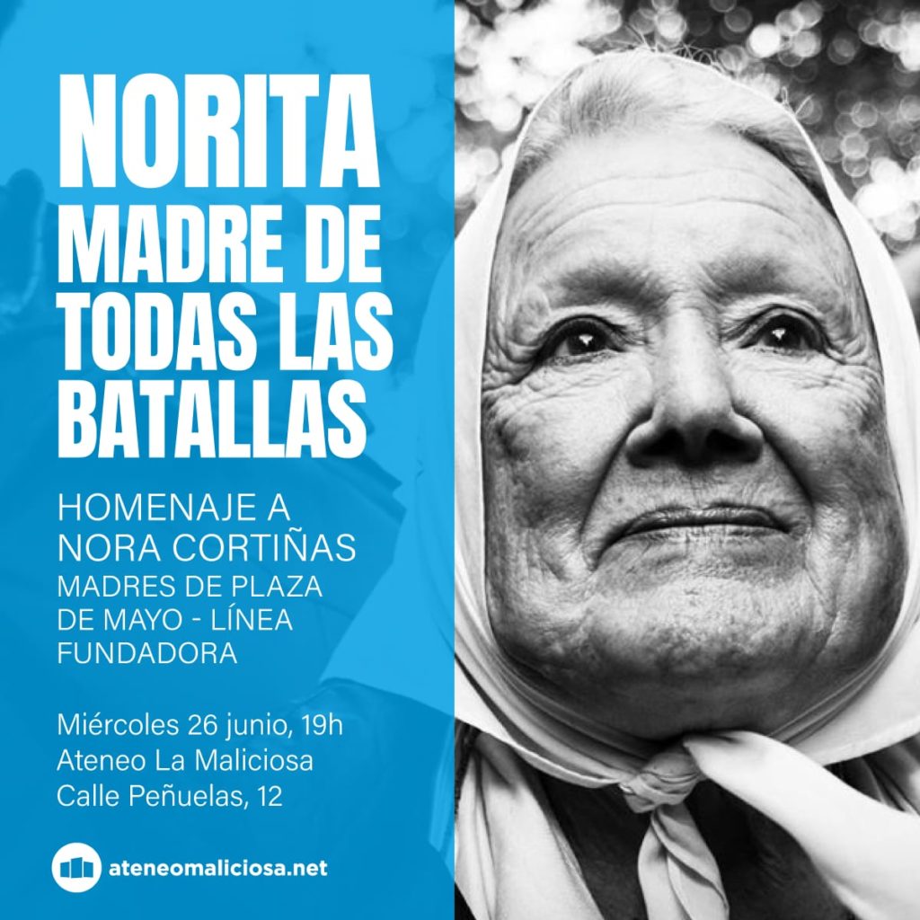 El 26 de junio, Día Mundial en Apoyo a las Víctimas de Torturta, celebramos en La Maliciosa un homenaje a Nora Cortiñas, Norita, presentando su biografía con el título «Norita, Madre de Todas las Batallas». CEAQUA, Ecologistas en Acción y Traficantes de Sueños organizaron el acto.